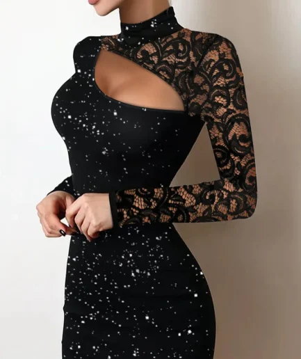 Select options This product has multiple variants. The options may be chosen on the product page Add to wishlist CompareLace Hollowed Out Halter Neck Solid Sequined Chiffon Slim Hip Skirt Women Sexy Party Mini Dress
