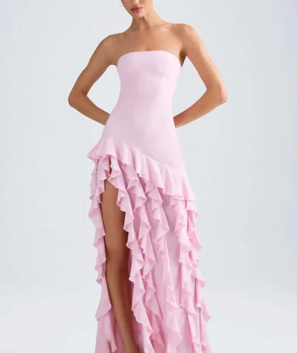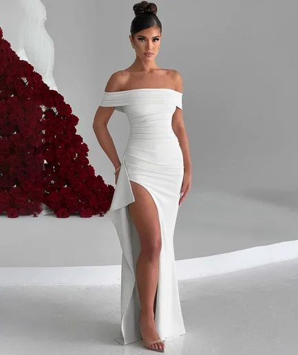 • RedPeony Women Elegant Off-shoulder Ruffled High Split Dress Slash Neck Backless Bodycon Sexy Evening Party Women Maxi Dress