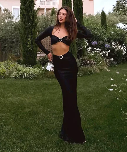 • RedPeony Women Dress Elegant Long Sleeves Crop Top Sexy Metal Buckle Skirt 2PCs Set Slim Fit Skirt Chic Evening Dress Women Suit