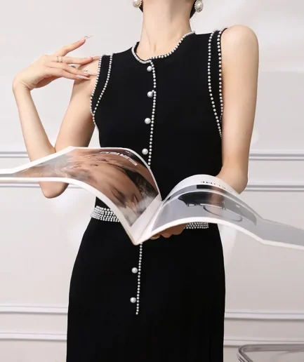 • 2025 Summer New French Pearl Sleeveless O Neck Black Midi tank Top T-shirt Knit Bridesmaid Fashion Dress for WomenNew