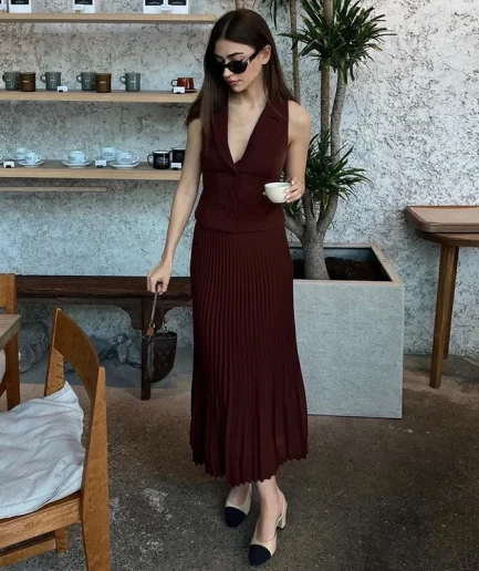 • RedPeony Women's Sleeveless Short Vest Top High Waist Solid Maxi Skirt Fashion Sets 2025 Folds Long Skirt Two Pieces Set