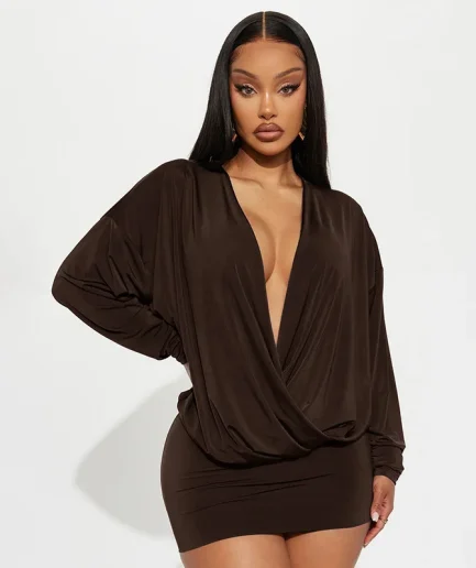 • Women's Elegant Deep V-Neck Mini Dress Full Sleeve Skinny Peach Hip Midnight Club Party Sexy Fashion Solid Bodycon Dress