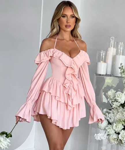 Women Summer Solid Pure Color Halter Ruffle Flare Sleeves Tiered Dress Sexy Elegant Birthday Party Clubwear Women Mini Dress