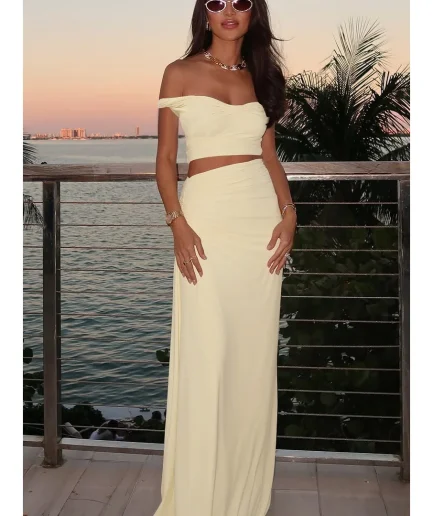• Women Summer Sexy Pleated Skirt Set One-Length Shoulder Patchwork Top High Waist Slim Long Skirt Vacation Party Club Women Dress