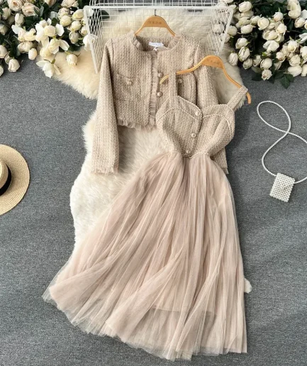 • Dresses Sets Korean Two Piece Suit Women Clothing Patchwork Gauze Crop Coats Gauze Tunic Sling Maxi Dress Outfits Sweet Chic SetNew