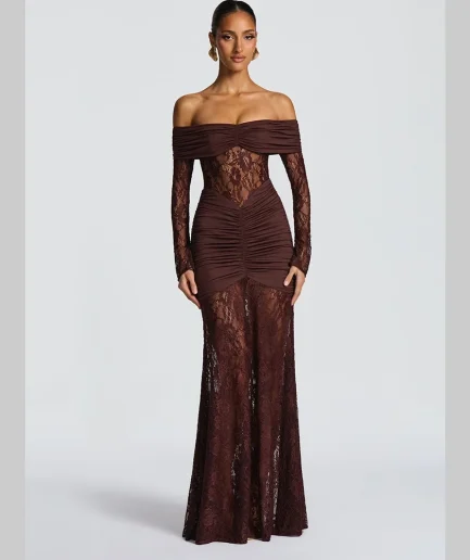 Elegant Long Sleeve Mesh Lace Patchwork Bodycon Dress Women Sexy Off-Shoulder Sheer Party Club Formal Evening Women Maxi Dress