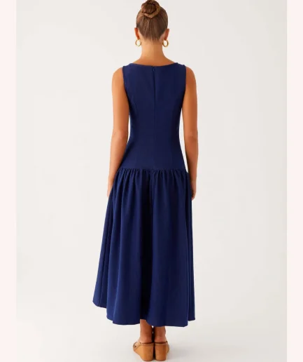 • Boutique Women's Fashionable Summer Long Dress French Neck Denim Sleeveless Slim Fit Button Decoration Solid Pattern Women DressNew