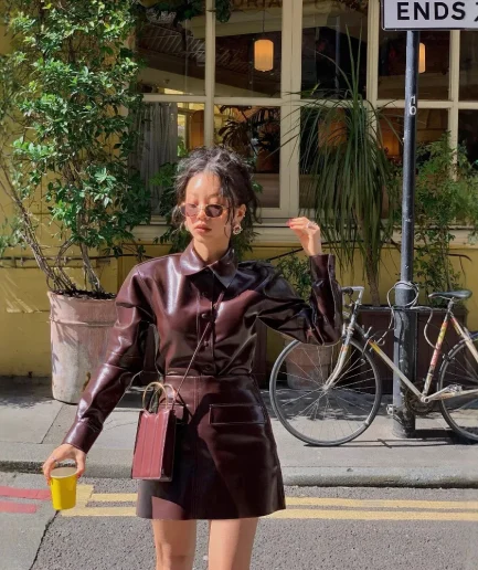 • Female Street Motorcycle Outfits Women Y2K Long Sleeve Bike Jacket Hip Package Short Skirt Suits Fashion Leather Mini Skirt Sets