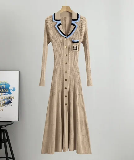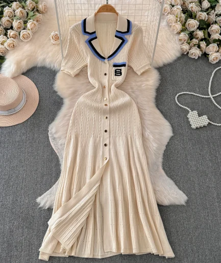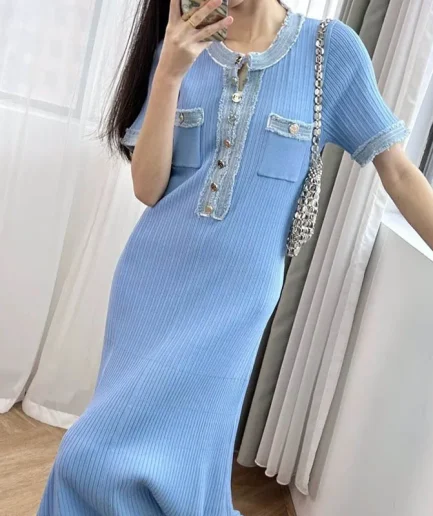 Guality A-line Flared Skirt Autumn Elegant French Denim Neck Short Sleeve Slim Bodycon Party Sweater Knitted Dresses for Women