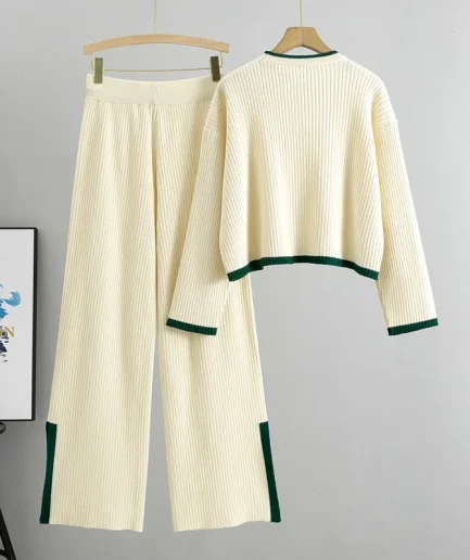 Spring Autumn Solid Sweater Suit Long Sleeve Top T Shirt Wide Leg Pants Loom Clothing Woman Knitted Lady Two Piece Set for Women