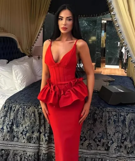 RedPeony 2025 Women Celebrity Sexy V-Neck Ruffles Red Maxi Long Bodycon Bandage Dress Elegant Evening Club Women Party Outfit