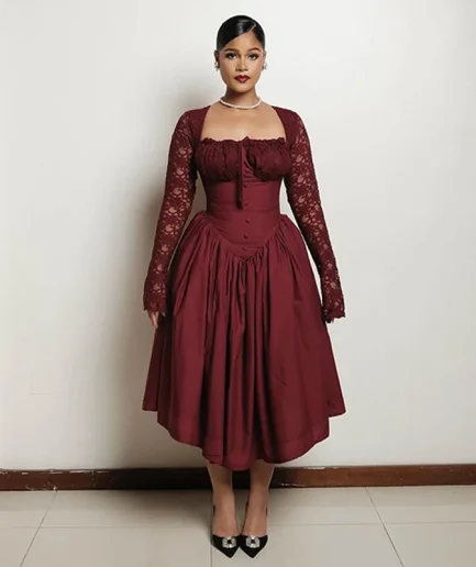 2025 Women Elegant Vintage Big Swing Lace Sleeve High Waist Dress Strapless Pleated Evening Sexy Night Party Women Prom Gowns