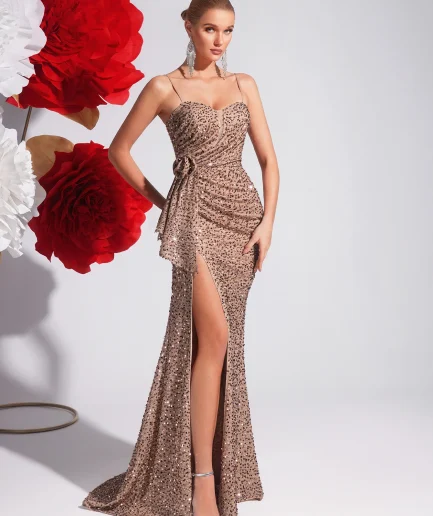 Women’s Sexy Bodycon Sequin Gown Long Mermaid Formal Evening Gowns Front Slit Flower Decoration