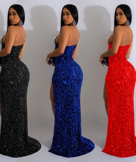Wedding Summer High Quality Party Sexy One Side Shoulder Prom Cut Out Sequin Slit Evening Maxi Dresses for Women