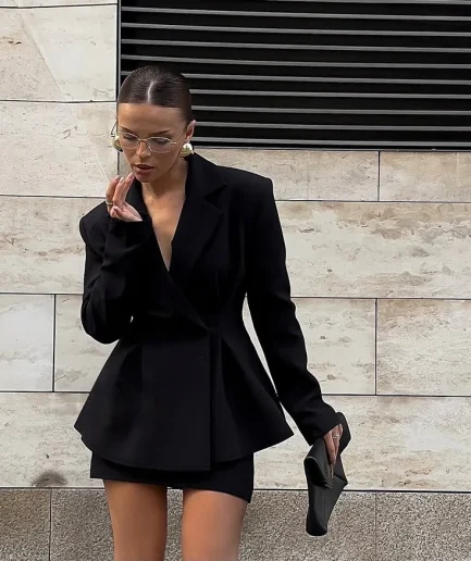 • Jacket A-line Skirts 2 Piece Office Lady Outfits Women Brown Shoulder Pad Cinched Waist Suit Elegant Blazer Coat Mini Skirt SetsNew