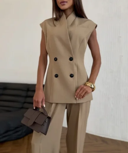 • 2025 Women Elegant Solid Jacket Pants Set Sleeveless Double Breasted Stand Collar Top Straight High Waist Trousers Women SuitNew