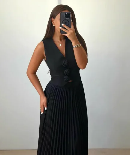 • Ladies 2-piece Two Pieces Fitness Solid Colors Korean Sleeveless Waistcoat Vest Top and Pleated Skirts Suits Sets for WomenNew
