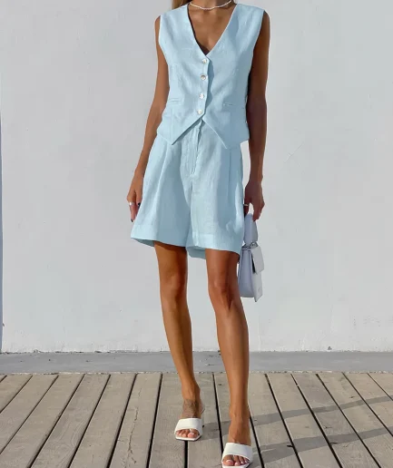 RedPeony Women’s Summer Casual Sleeveless Vest Shorts Two-Piece Set Cotton and Linen Suit Vest Set