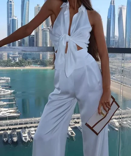 • Women Sexy Swinging Collar Halter Lace up Backless Vests Top Skinny Pants Streetwear Party Club Pants 2 Piece Set Women SuitsNew