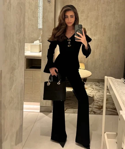 • Two Piece Set Women Outfit 2026 Autumn Retro Black Sexy Elegant Temperament V-Neck Slim Fit Top High Waist Flared Pants SetNew
