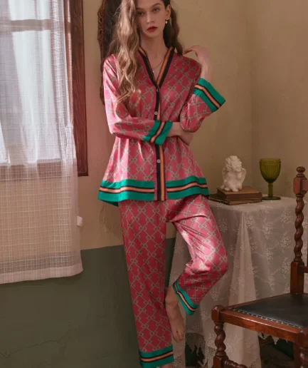 Lapel Nightwear Women’s Autumn Long Sleeve Cardigan Trousers Sets Button Home Wear Suit Sleepwear Silk Satin Print Pajamas