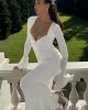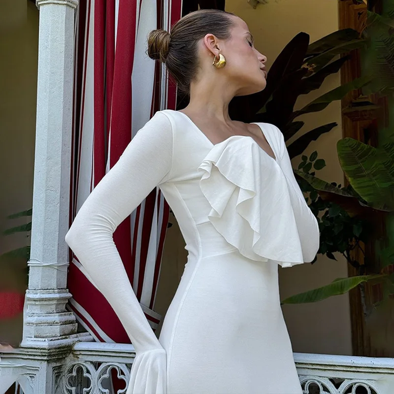 RedPeony Women Spring V-Neck Solid Long Flare Sleeves Ruched Ruffles Sexy Slim Dress Elegant Evening Party Club Women Maxi Dress