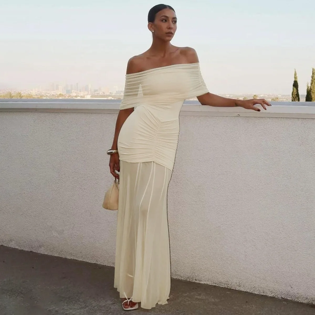 Sexy Strapless Mesh Patchwork Folds Long Dress Women Sleeveless Backless Pleated Slim Evening Party Club Women Maxi Gowns