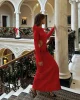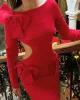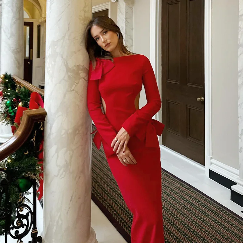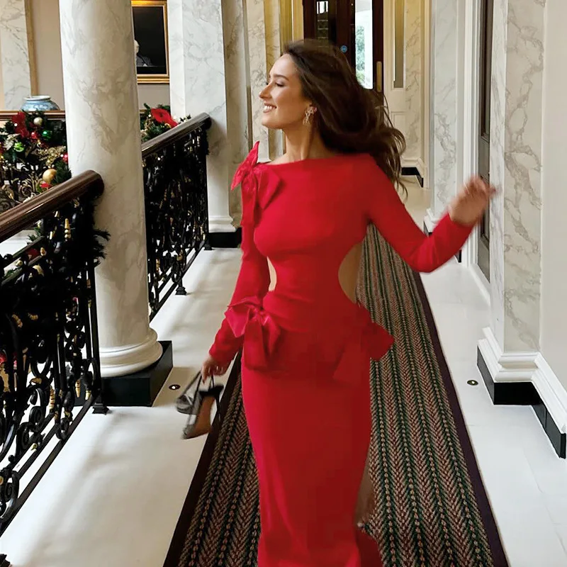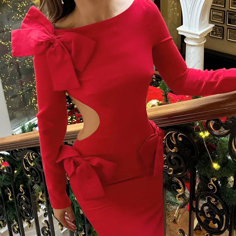 Women 2025 New Year Edition Autumn Long Sleeved Dress Festival Dress up Party Slim Hip-packing Long Skirt Bowknot Hollow Out