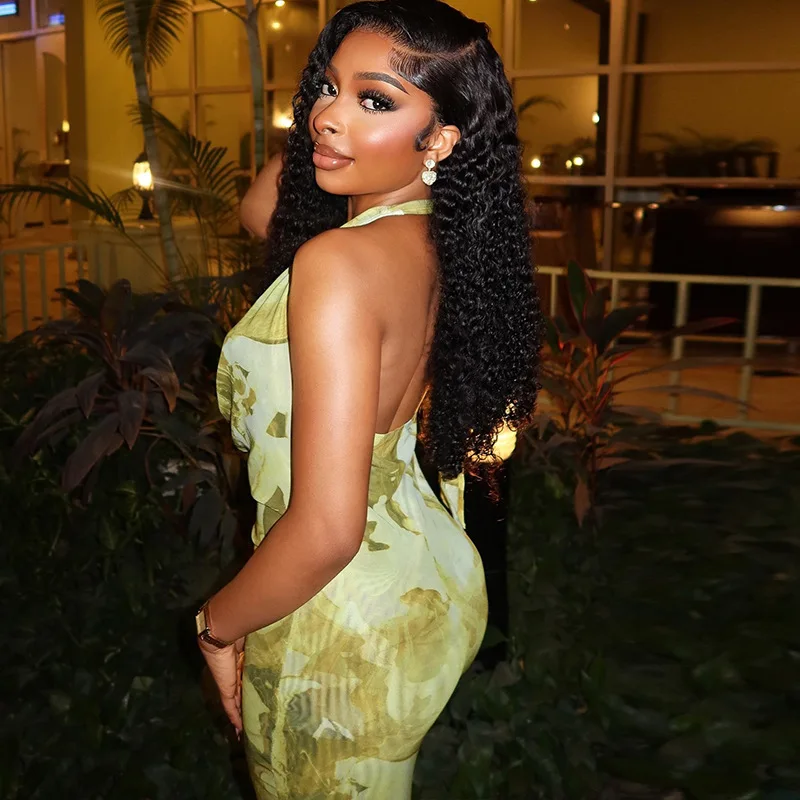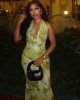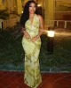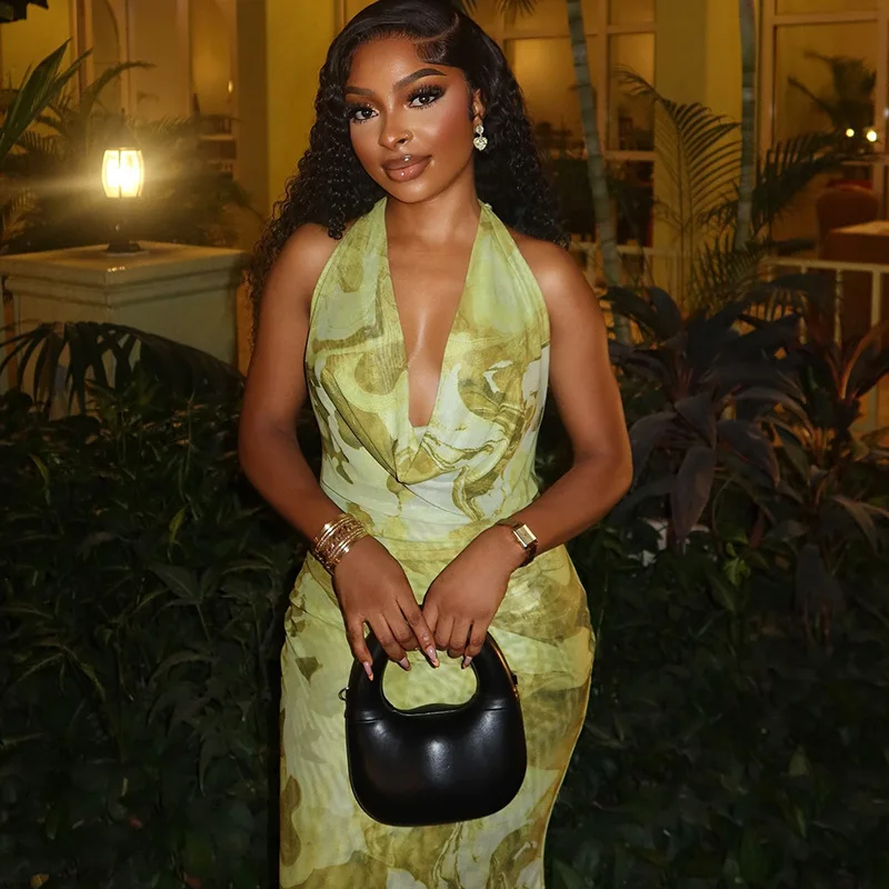 Women 2025 Summer Sexy Patchwork Mesh Dress Elegant Halter Neck Ruched Chic Birthday Party Club Vacation Women Maxi Dress