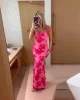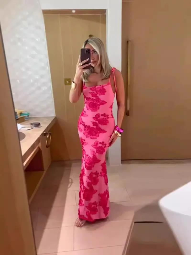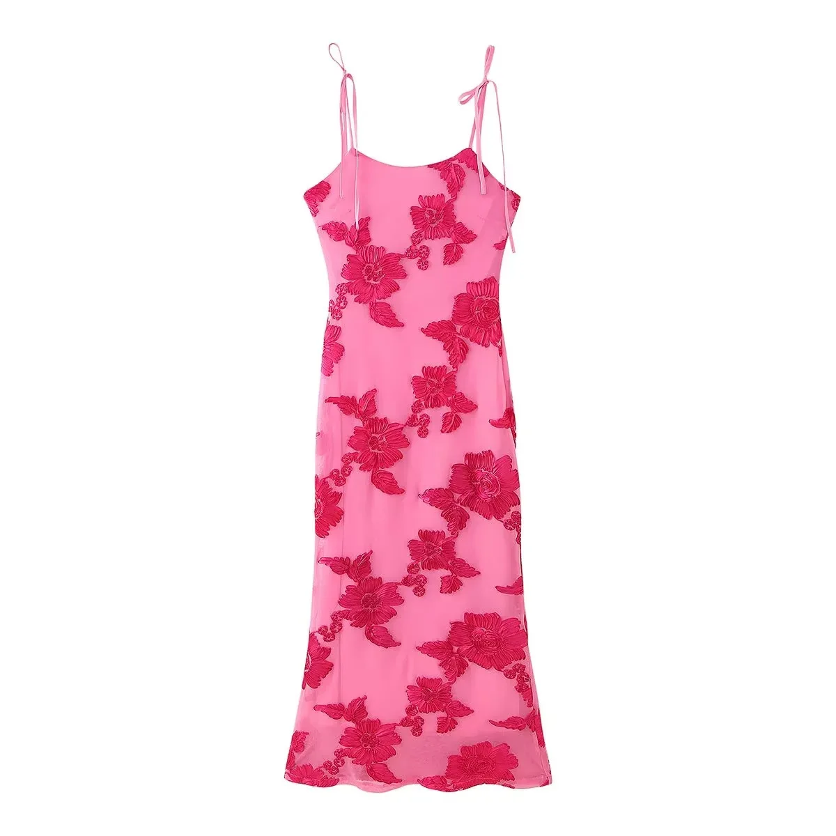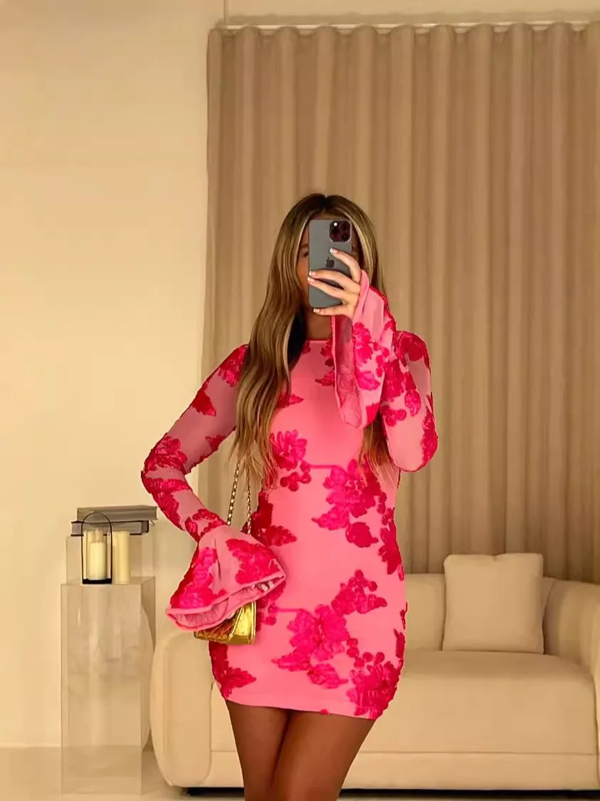 Women Long Sleeve Embroidered Birthday Dress Elegant Party Dresses Backless Rose Pink Floral Mesh Short Dress